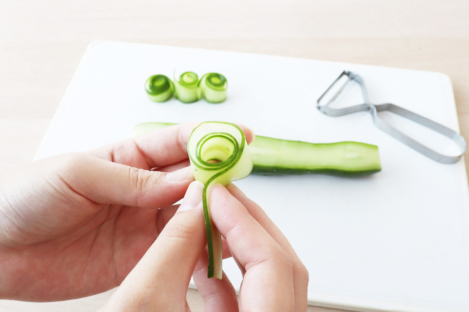 きゅうりはピーラーでリボン状に削り、端から巻く。ミニトマトは半分に切り、スライスチーズは星形の型でくり抜く。