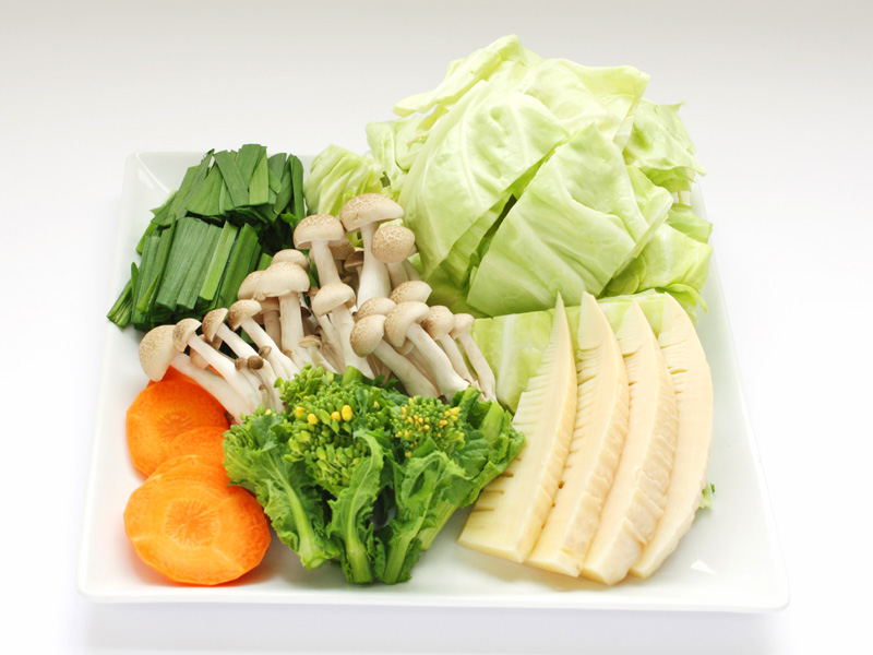 キャベツはひと口大に切り、ニラ・菜の花は4cmの長さに、にんじんは輪切りにする。タケノコはくし形切りにする。しめじは根元を切りほぐしておく。
