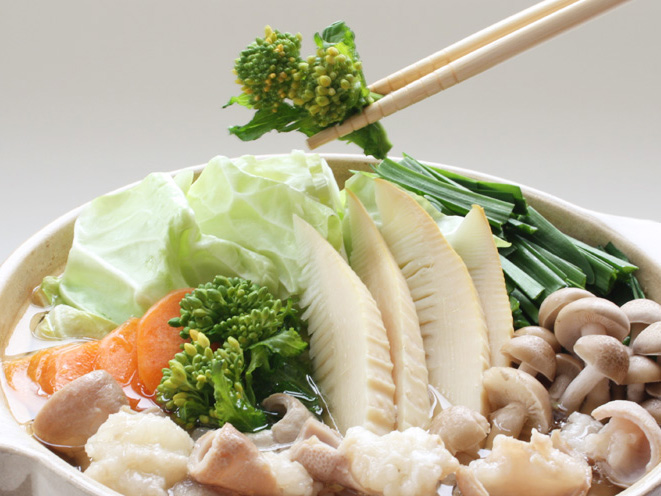 タケノコ、菜の花など、春ならではの野菜をふんだんに使った、風味豊かなもつ鍋です。菜の花は煮込みすぎると苦みが増すので気をつけましょう。