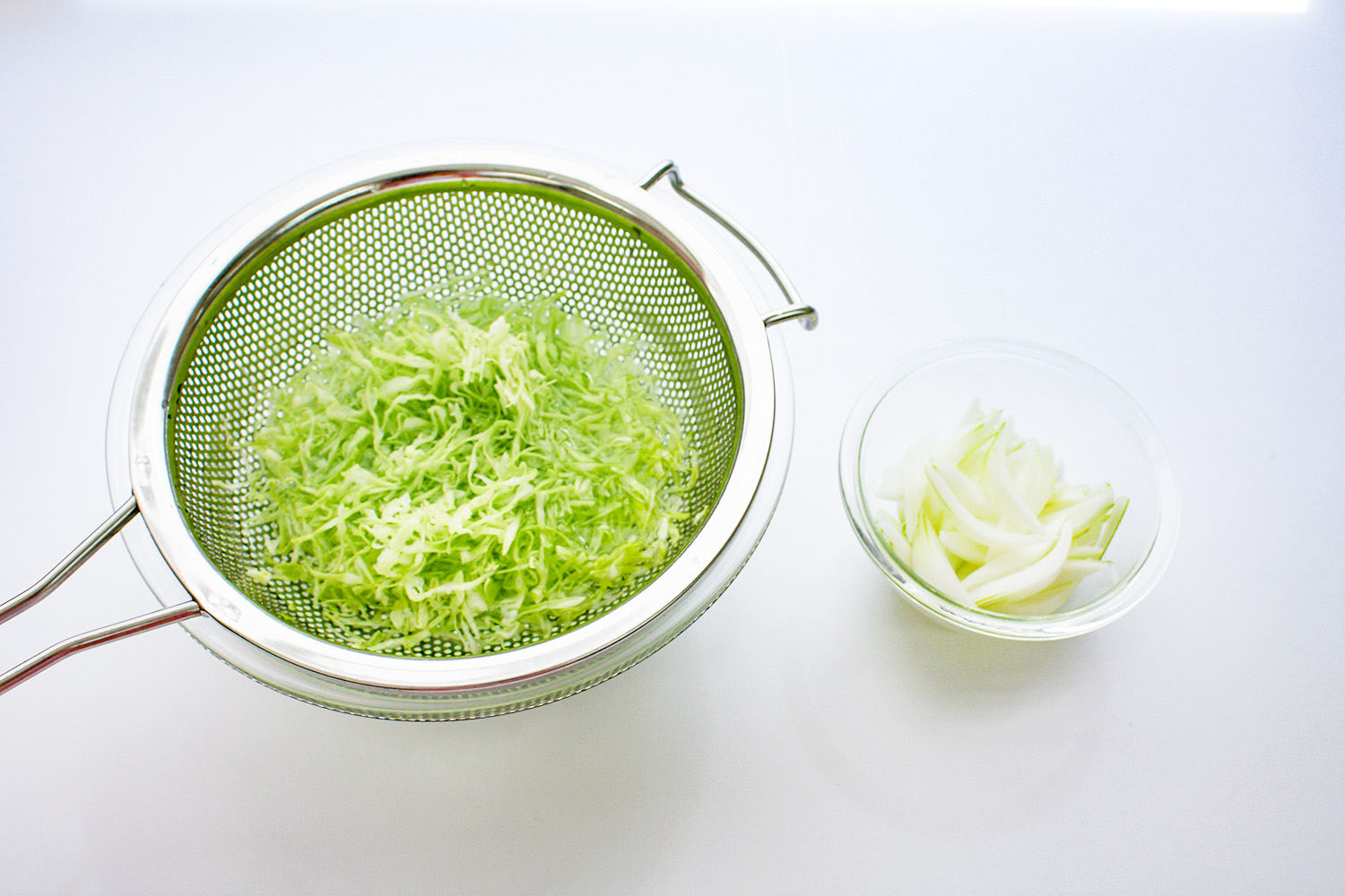 キャベツは千切りにして、電子レンジで600Wで40秒加熱する。玉ねぎはくし形に切っておく。