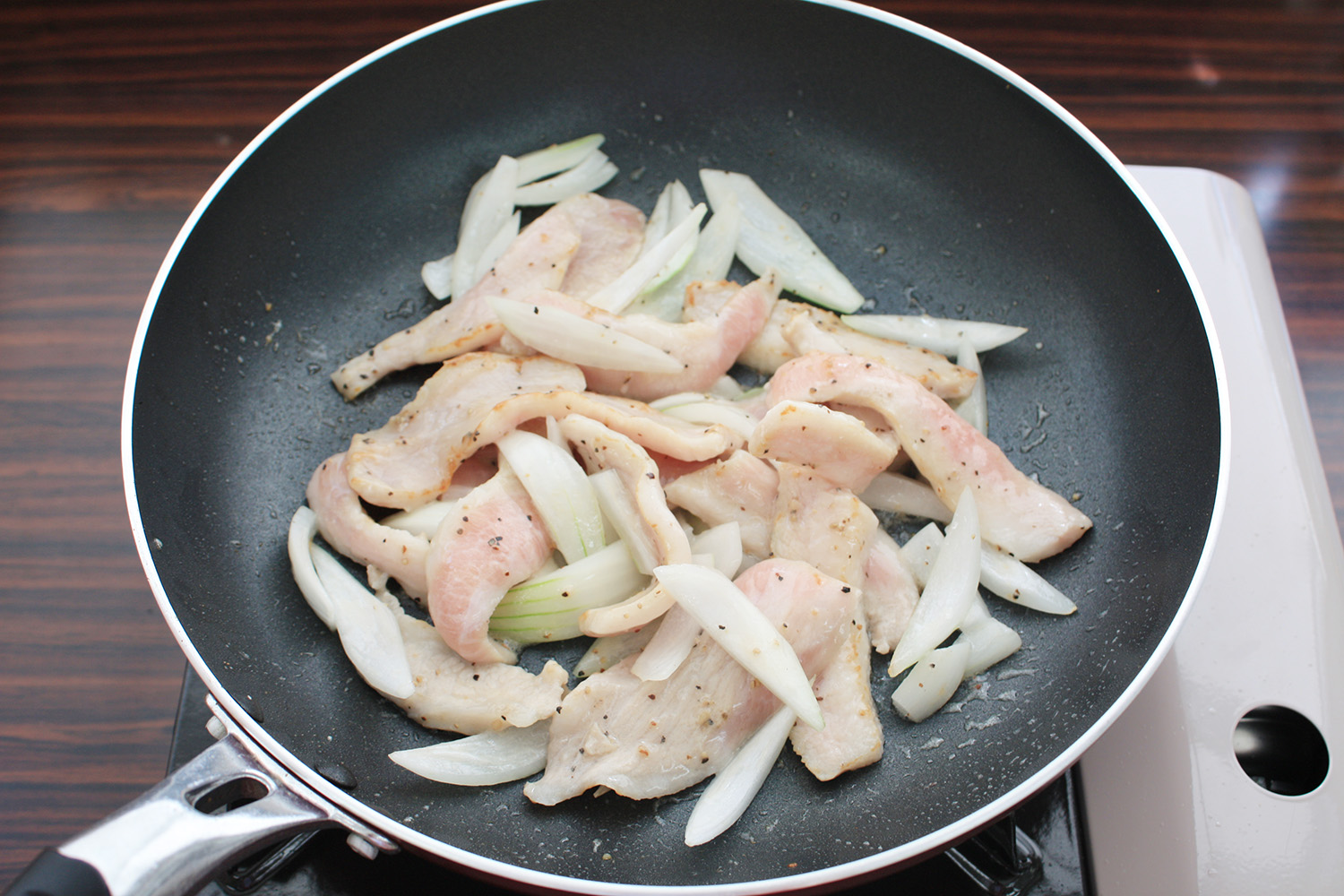 フライパンにごま油を引き、豚トロと玉ねぎを炒める。