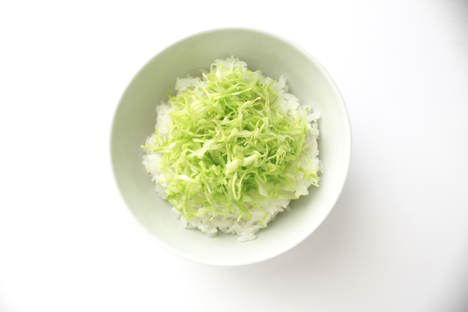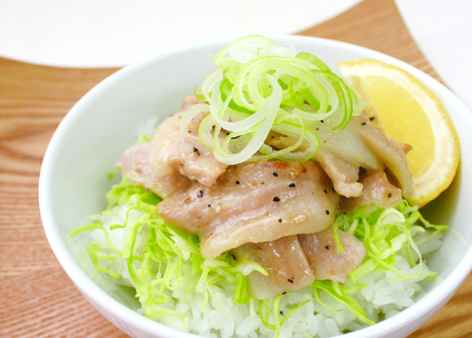 どんぶりにごはんを盛り、キャベツをのせ塩コショウをふる。(2)をのせる。くし形に切ったレモンを添える。